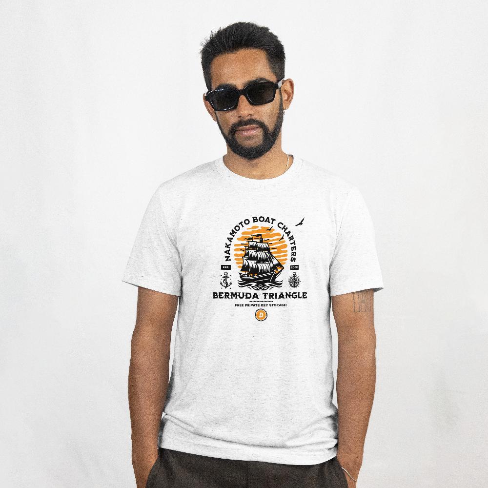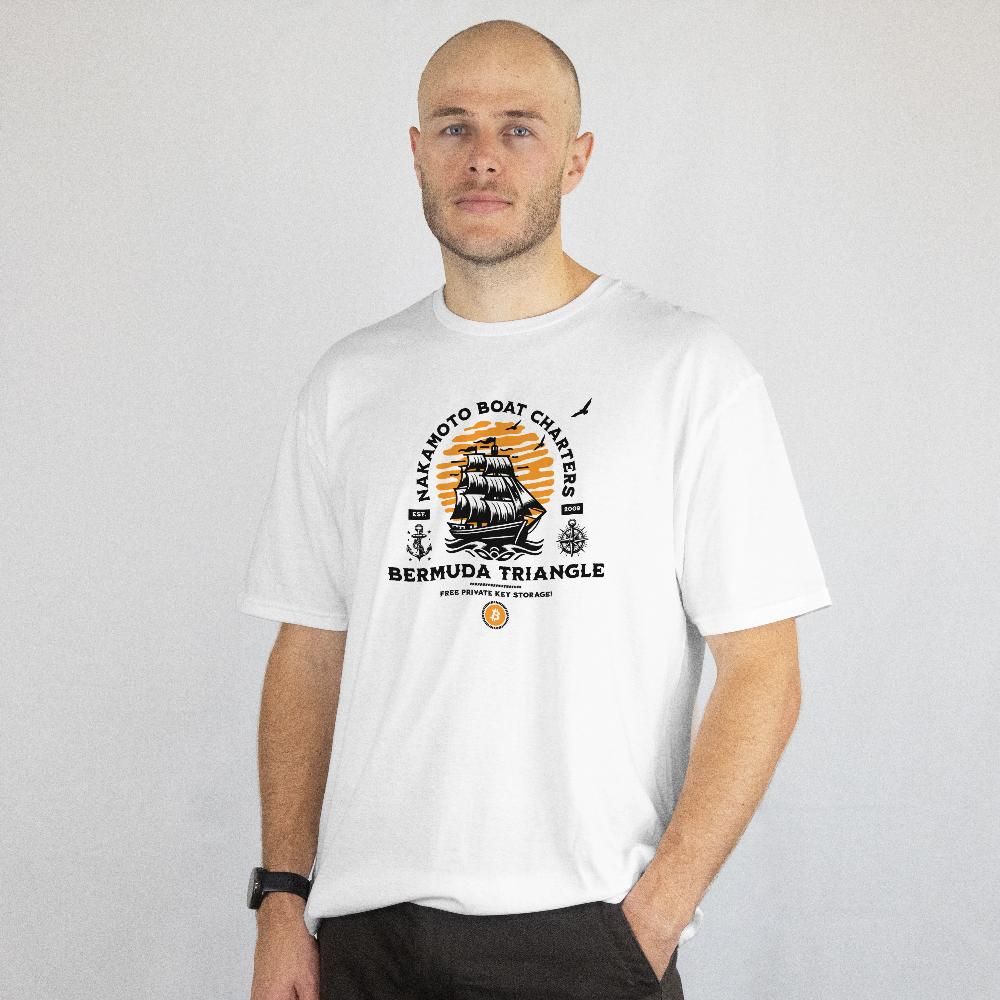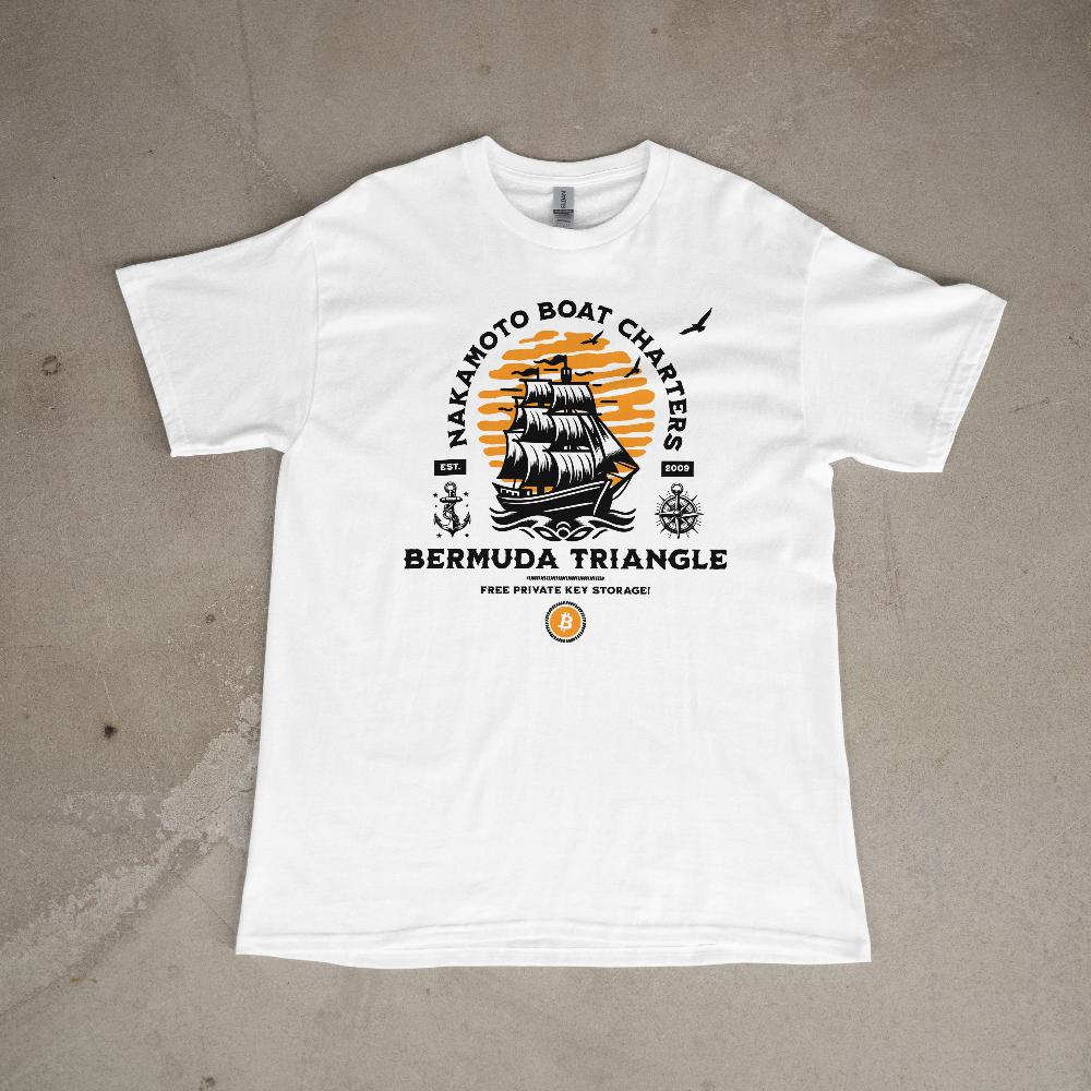 Nautical theme shirt – Nakamoto boat charters text – Bermuda Triangle (where legends state boats go missing) – free private key storage.