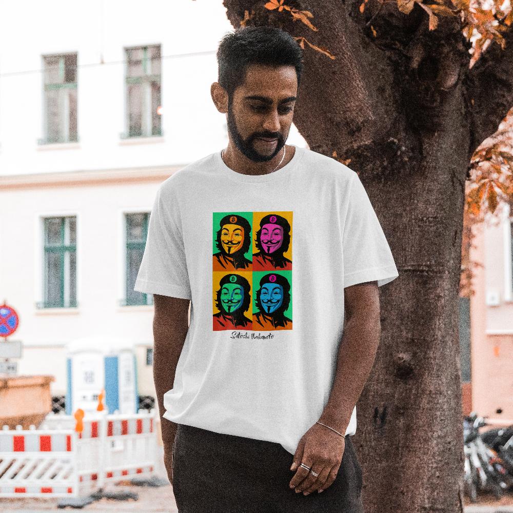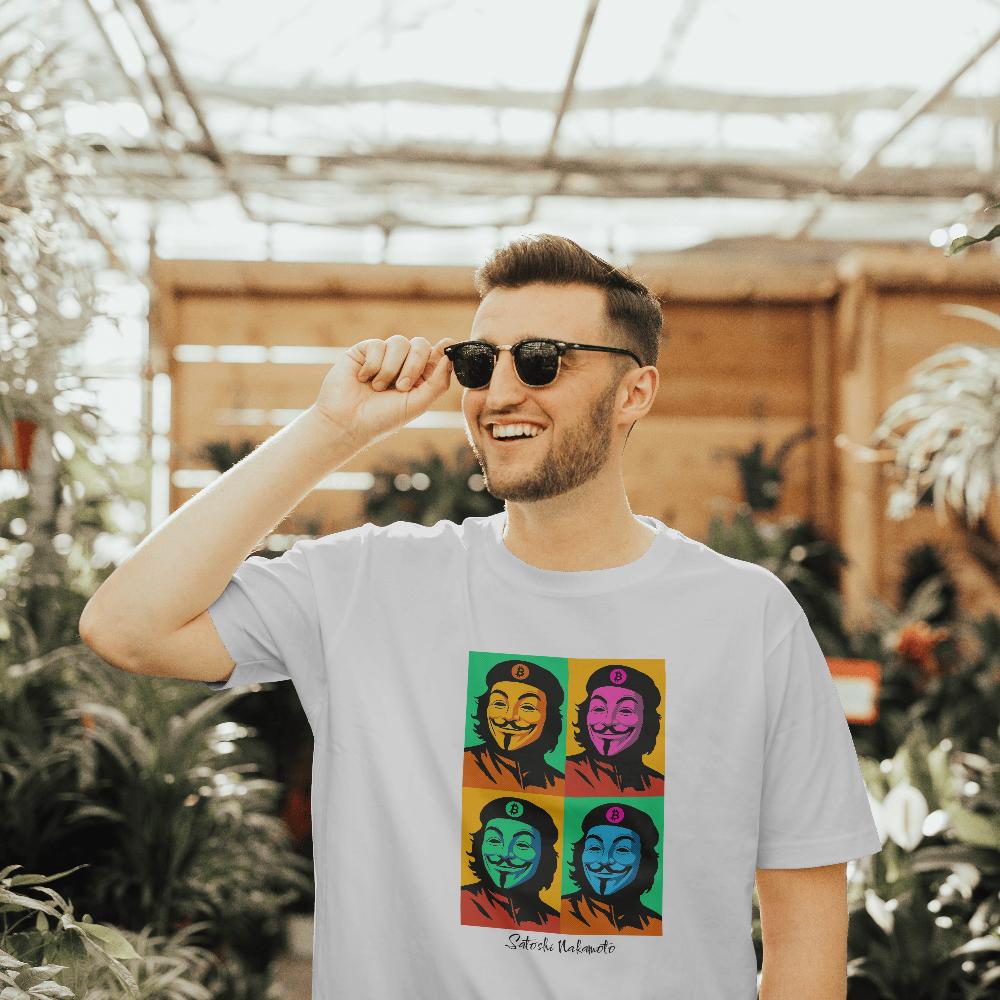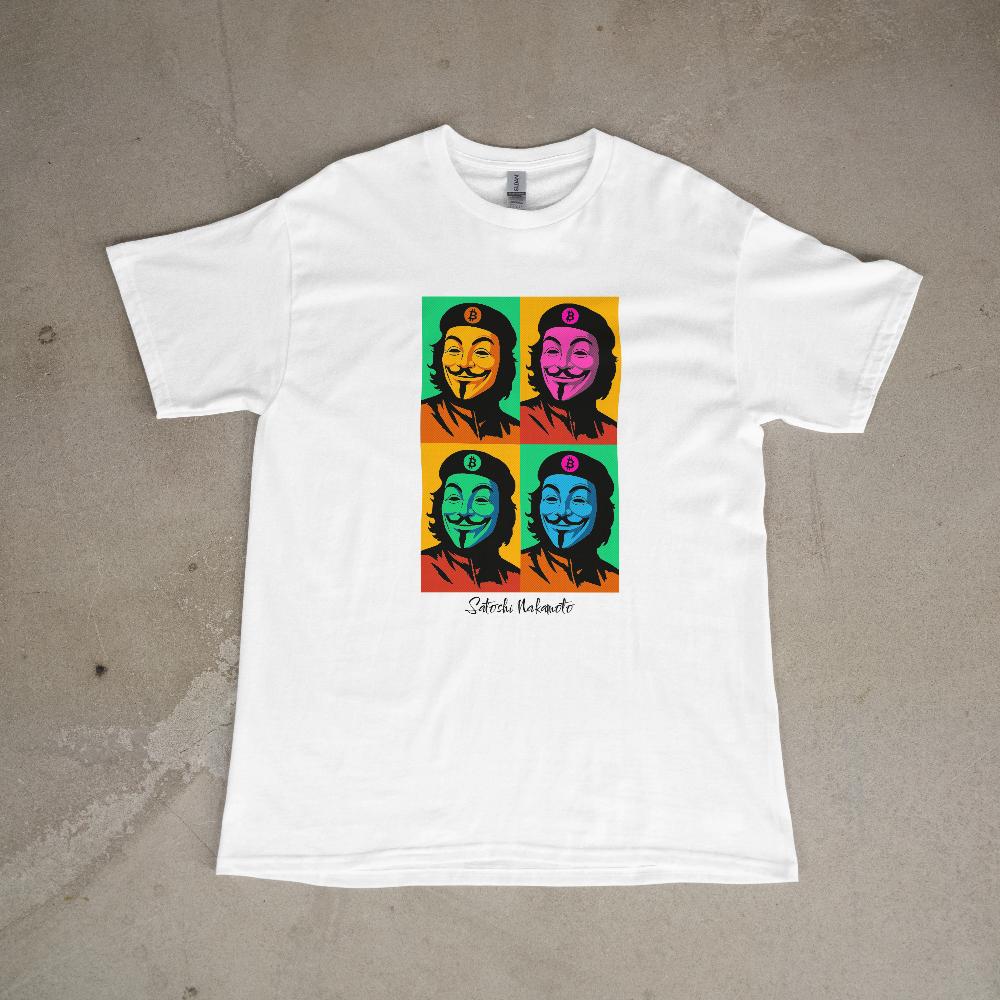 Inspired by Andy Warhol’s iconic Shot Marilyns art, this shirt shows an anonymous figure in the style of Che Guevara rebel with Satoshi Nakamoto signature beneath.