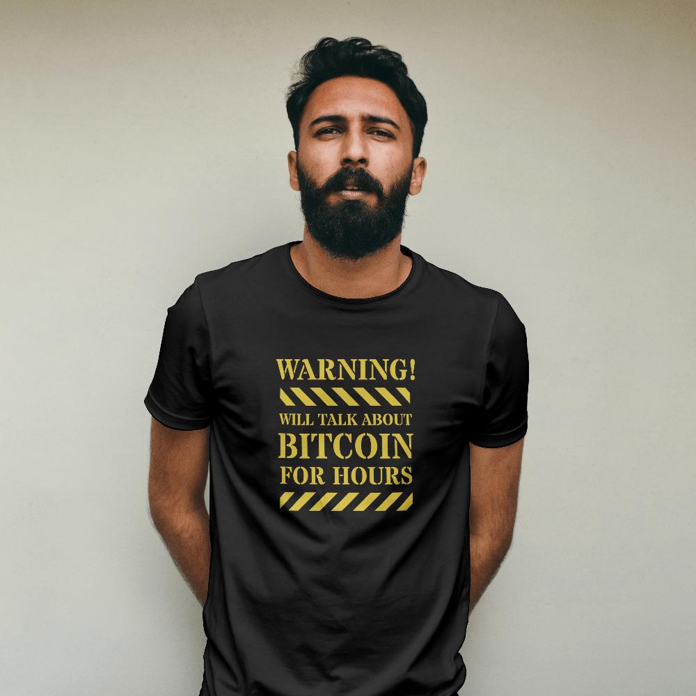 Yellow warning with chevron pattern. Text: ‘Warning, will talk about bitcoin for hours’